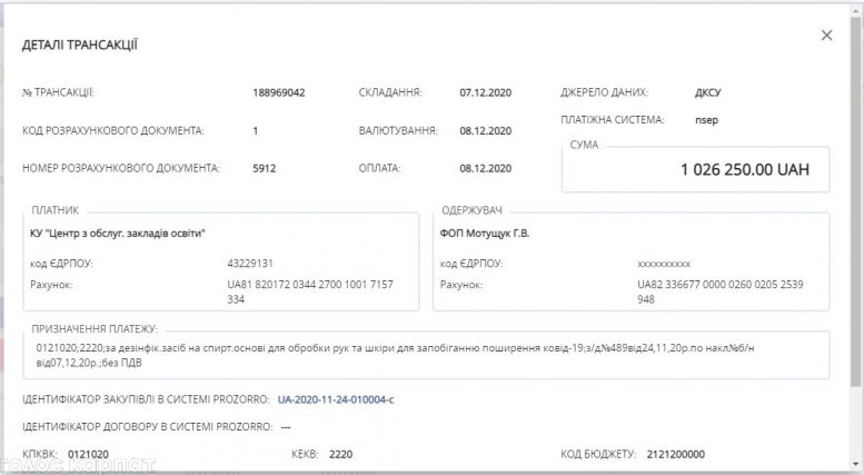 24 листопада КУ “Центр з обслуговування закладів освіти Виноградівського району” Виноградівської районної ради разом з ФОП Ганною Мотущук уклали договір №489 на закупівлю деззасобів на суму 1 938 490 гривень. Вже 7 грудня казначейство перерахувало їй 1 026 250 гривень, 21 – ще 912 240 гривень.
