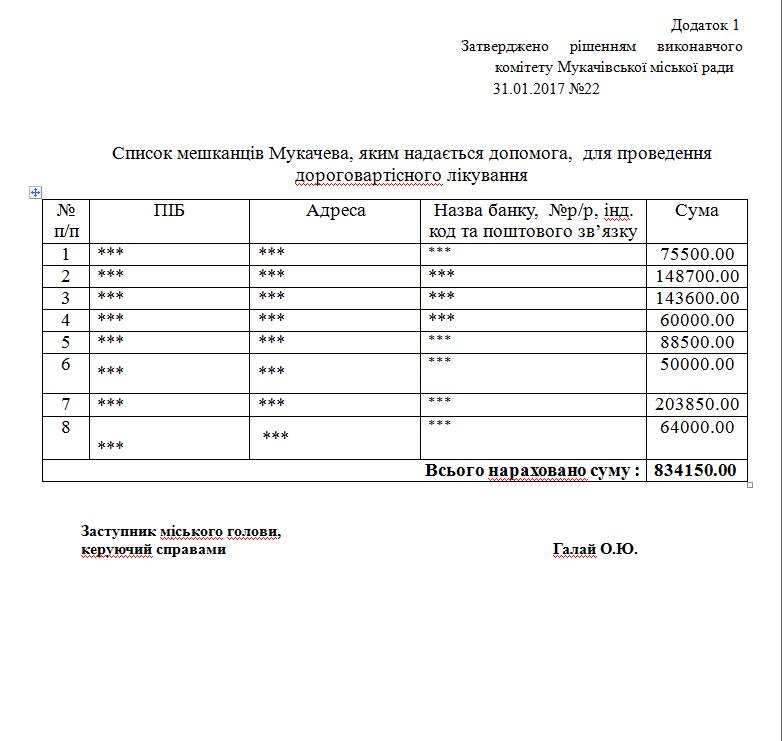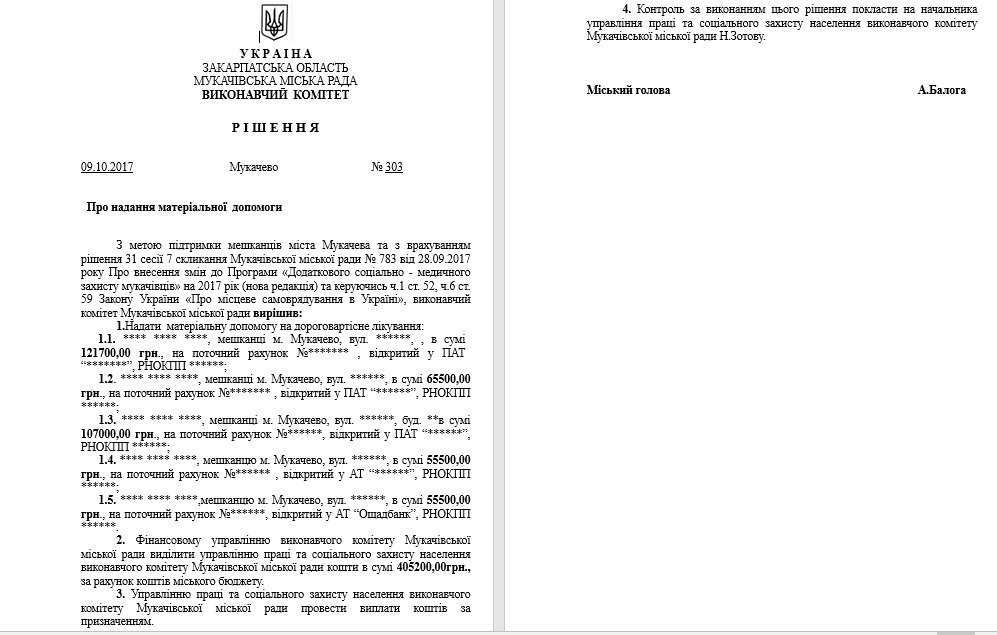 867 000 грн на лікування виділив міський голова невідомій особі. Молодець! Можливо врятував комусь життя! Але не він! А мешканці Мукачева скинулись на цю допомогу. Тому, вони мають право знати