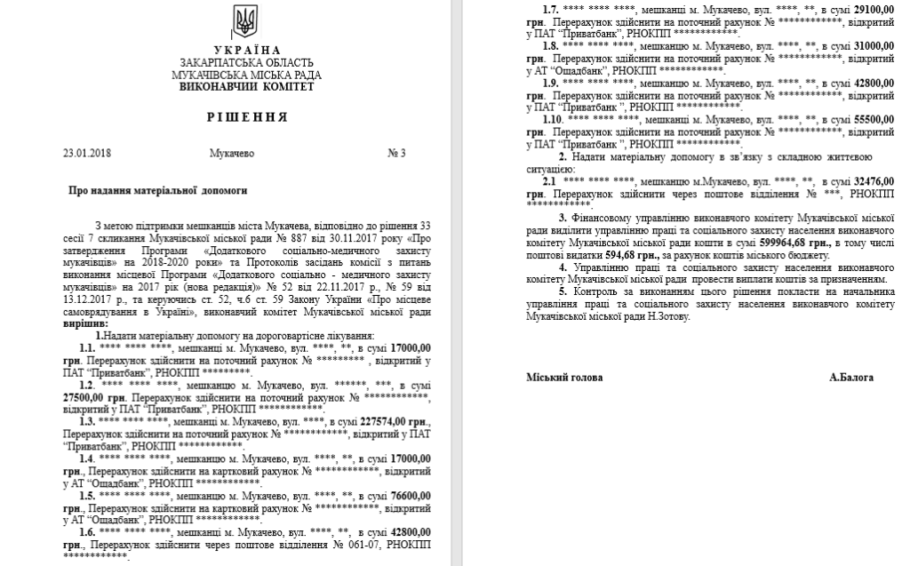 867 000 грн на лікування виділив міський голова невідомій особі. Молодець! Можливо врятував комусь життя! Але не він! А мешканці Мукачева скинулись на цю допомогу. Тому, вони мають право знати