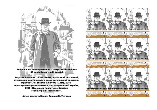 Текст на аркуші: «Августин Волошин (1874 – 1945) – український політичний, культурний, релігійний діяч, греко-католицький священик Мукачівської єпархії, Приятель Пласту, 1938 – Прем’єр-Міністр автономного уряду Карпатської України, 1939 – Президент Карпатської України, Герой України (посмертно)».