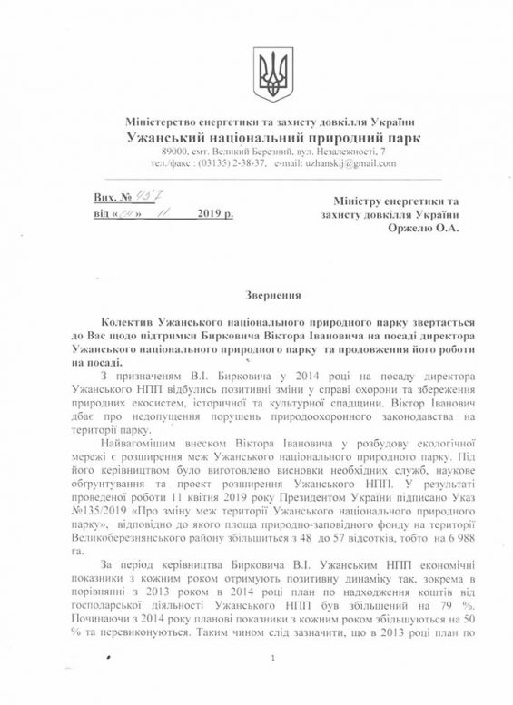 Отож, при прийнятті рішення просимо Вас врахувати думку трудового колективу та врахувати цей факт, що теперішній т.в.о. голови Держекоінспекції Канцурак у відношенні Ужанського НПП є зацікавленою упередженою особою, що не підтримує ідеї заповідного фонду в т.ч. і Ужанського НПП, протягом багатьох років займається дестабілізацією в галузі охорони навколишнього природного середовища https://provse.te.ua/…/lyudy-yanukovycha-povertayutsya-v-m…/.