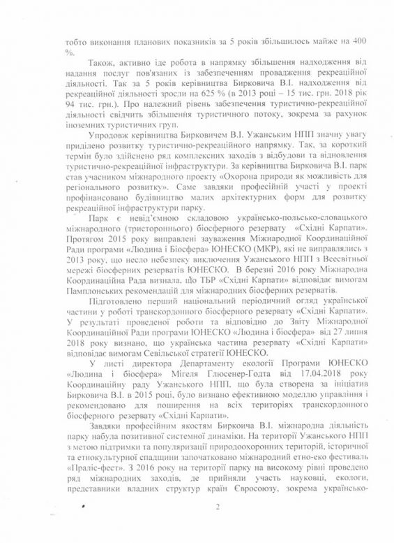 Шановний пане Міністр повідомляємо Вас, що під керівництвом Бирковича В.І. відбулись позитивні зміни у справі охорони та збереження природних екосистем, історичної та культурної спадщини.