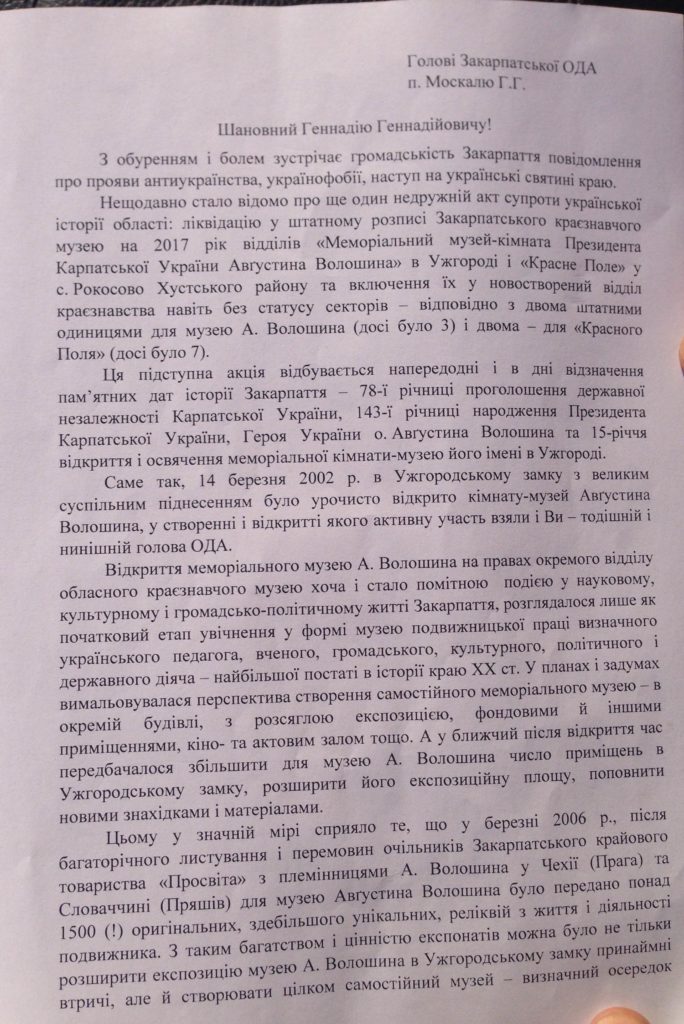 Громадськість Закарпаття просить Москаля відновити статус музею Президента Карпатської України Августина Волошина (ДОКУМЕНТ)