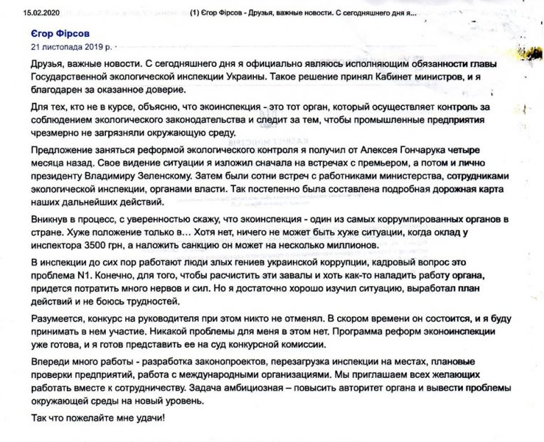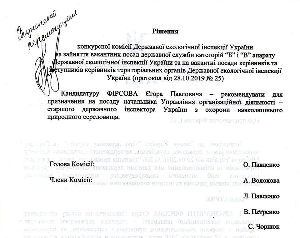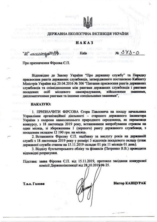 На той час Єгор Павлович Фірсов нібито працював на посаді начальника управління організаційної роботи – старшим державним інспектором України з охорони навколишнього природного середовища зазначеної Інспекції. Призначено його на цю посаду наказом тимчасово виконуючого обовязки Голови Віктора Канцурака № 373-о від 18 листопада 2019 року. Підстава: заява Фірсова Є.П. від ‼️15.11.2019, протокол засідання від ‼️ 28.10.2019 № 25.