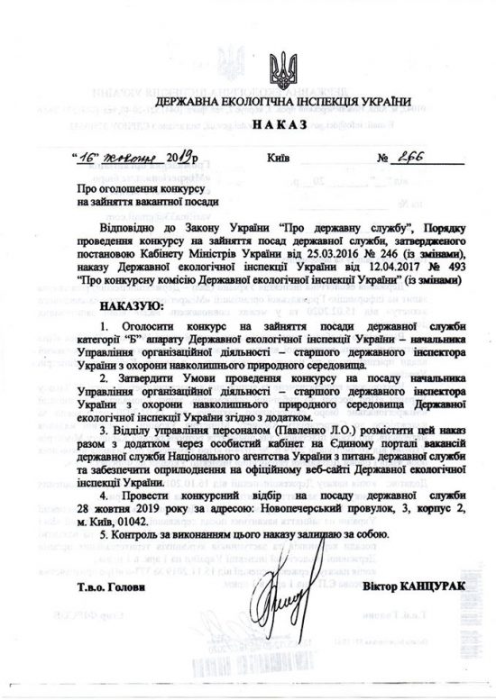 16 жовтня 2019 року тимчасово виконуючим обов`язки Голови Державної екологічної інспекції України Віктором Канцураком нібито (бо його не оприлюднено, а значить не набуто статусу офіційного) видається наказ № 266 “Про оголошення конкурсу на зайняття вакантної посади”, яким ‼️оголошено конкурс на зайняття посади державної служби категорії “Б” апарату Державної екологічної інспекції України – начальника Управління організаційної роботи – старшого інспектора України з охорони навколишнього природного середовища;