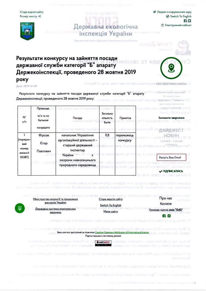 30 жовтня 2019 року результати конкурсу на зайняття посади державної служби категорії “Б” апарату Держекоінспекції оприлюднено на офіційній сторінці