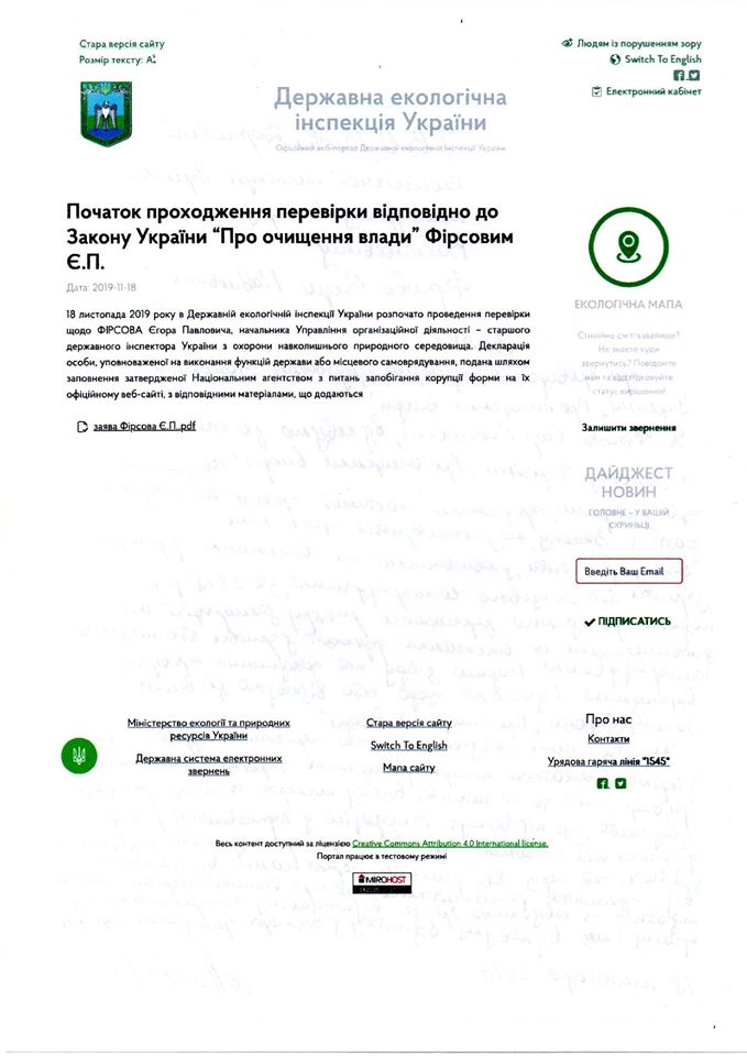 ‼️18 листопада 2019 року Єгор Фірсов подає заяву про проведення перевірки, передбаченої Законом України “Про очищення влади”. ✅ І це правдива дата! День, коли почалася легалізація на посаді в державному органі нагляду (контролю). І все б нічого, якби від компетентності та професійності очільника не залежали мільйони життів Українців, які не можуть внаслідок дій (бездіяльності) інспекторів з охорони навколишнього природного середовища реалізувати гарантоване Конституцією природне право на безпечне для життя, здоров`я довкілля.