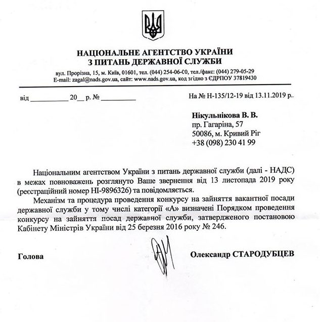 Задля упередження цієї ситуації мною скеровано звернення до Національного агенства України з питань державної служби. Втім, чергова відписка лише посилила недовіру до тих, хто сьогодні називається владою.