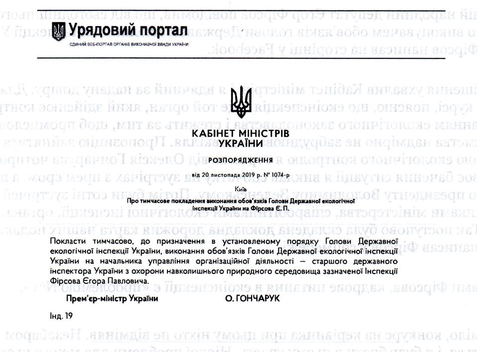 Єгор Фірсов, Ви незаконно очолили центральний орган виконавчої влади, а, відтак, усі видані в період з 20.11.2019 по теперішній час Вами, як Головою Державної екологічної інспекції України, розпорядчі акти не утворюють жодних юридичних наслідків.