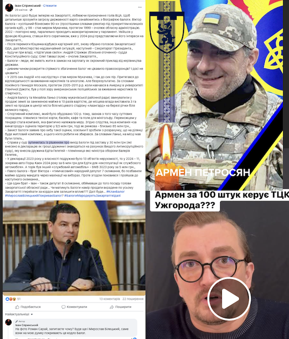 Пробну кулю активіст вирішив загнати в лузу очільників Закарпаття. Для цього оприлюднив публікацію загальновідомих фактів з життя нардепа Віктора Балоги і голослівно заявив, що останній «досі будує імперію на Закарпатті, лобіюючи призначення голів ВЦА». Допис проілюстрував фотографією голови Закарпатської облради Романа Сарая, а в коментарі до публікації пояснив, що, на його думку, Р. Сарай і голова Закарпатської ОДА Мирослав Білецький покривають кодло Балог.