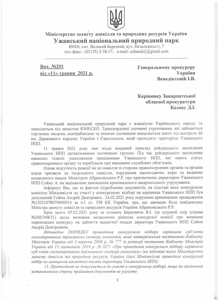 Колектив Ужанського національного природного парку звернувся до Генерального прокурора України Ірини Венедіктової з проханням взяти під особистий контроль розслідування побиття працівників установи та захоплення майна Ужанського НПП.
