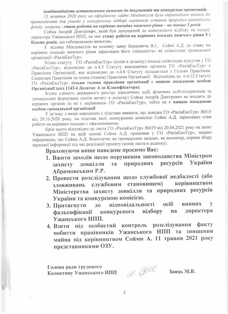 Також у листі вказується на факти порушення чинного законодавства Міністром захисту довкілля та природніх ресурсів Романом Абрамовським та вимагається притягнути до відповідальності осіб причетних до фальсифікації конкурсного відбору  на посаду директора Ужанського НПП.