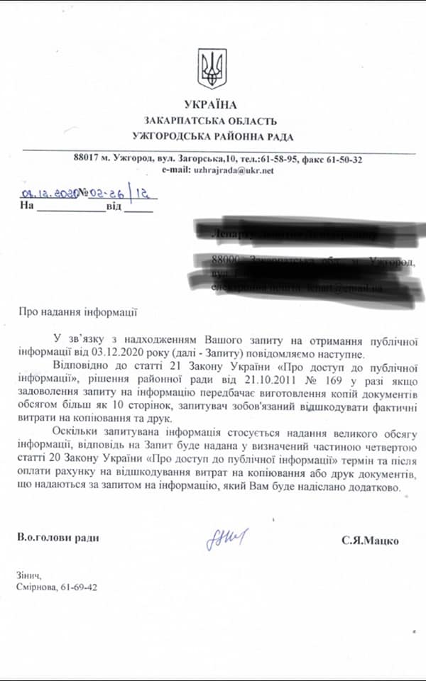 Тобто, щоб зробити 20-30 копій листочків, Ужгородській райраді потрібно аж 20 днів.Крім того, райрада хоче отримати за надання відповідних копій ще і оплату, що прямо суперечить частині четвертій ст. 21 Закону України «Про доступ до публічної інформації», оскільки запитувана інформація становить суспільний інтерес.Тим більше, що питання, яке було порушено в запиті має неабияку важливість для громади.Мова в запиті йшла про те щоб отримати від Ужгородської райради належним чином завірені копії рішень про ліквідацію та всіх іншіх документів, на підставі яких було прийнято рішення про ліквідацію 4 шкіл мистецтв Ужгородського району.
