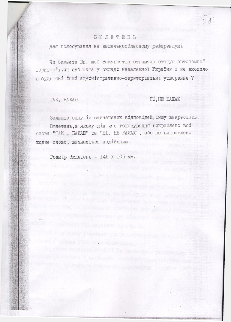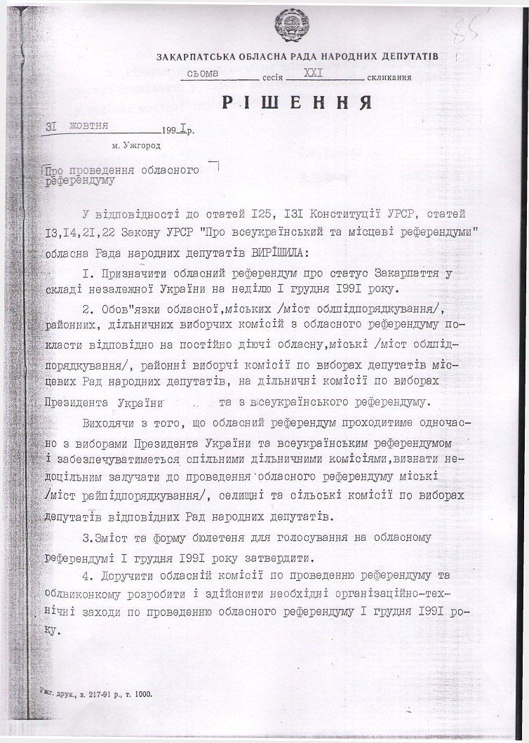 31 жовтня 1991р., не дочекавшись жодного обґрунтування чи пропозицій комісії, обласна рада своїм рішенням призначає обласний референдум на 1 грудня 1991р. й затверджує бюлетень із текстом: «Чи бажаєте Ви, щоб Закарпаття отримало статус автономної території, як суб’єкта у складі незалежної України, і не входило в будь-які інші адміністративно-територіальні утворення?» Однак це рішення обласної ради президія не наважилася підписати, знаючи наперед, що рано чи пізно доведеться відповідати. А рішення без підпису не є дійсним!