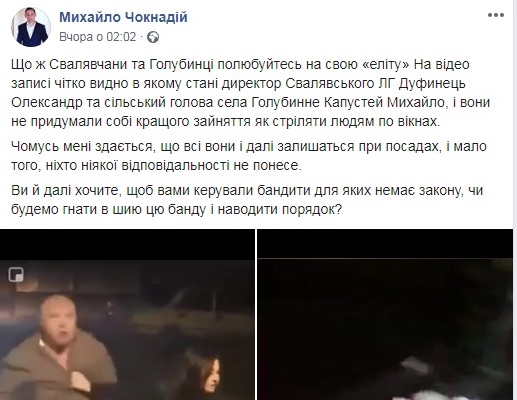 Що ж Свалявчани та Голубинці полюбуйтесь на свою «еліту» На відео записі чітко видно в якому стані директор Свалявського ЛГ Дуфинець Олександр та сільський голова села Голубинне Капустей Михайло, і вони не придумали собі кращого зайняття як стріляти людям по вікнах.
