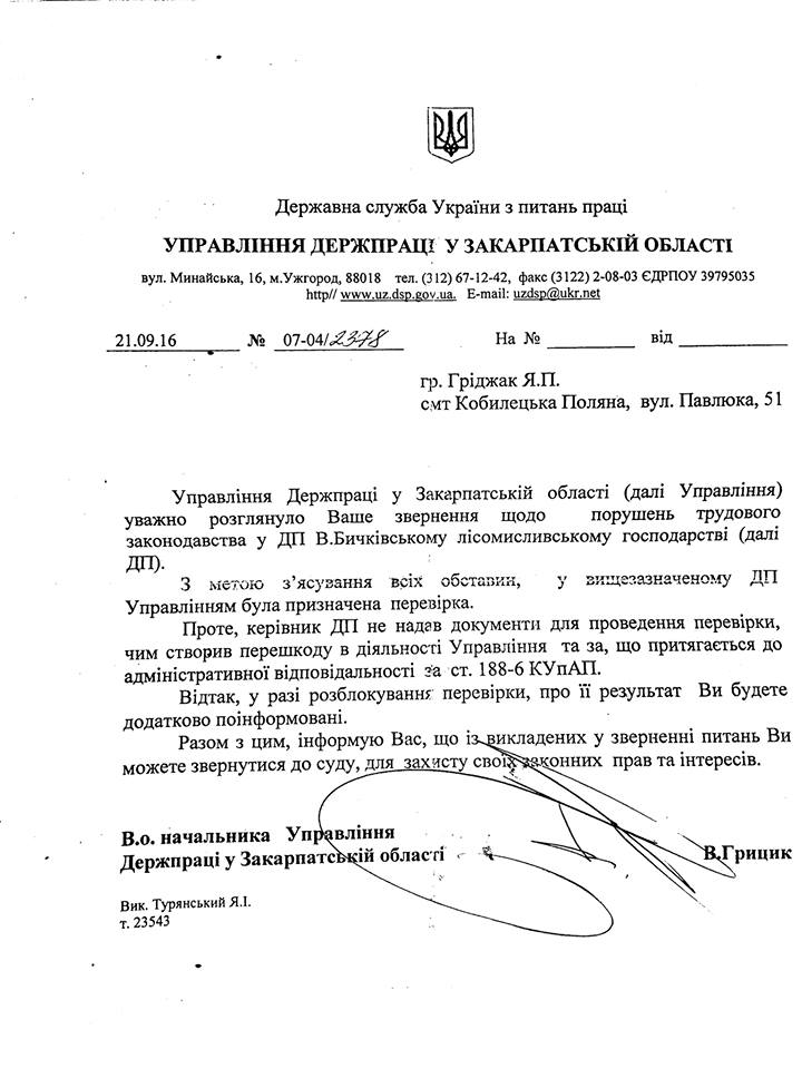 Керівник ДП”Великобичківське ЛМГ” Юрій Сойма притягнутий до адміністративної відповідальності за ненадання документів інспекції праці для перевірки про порушення Кодексу “Про працю” стосовно працівників держпідприємства.