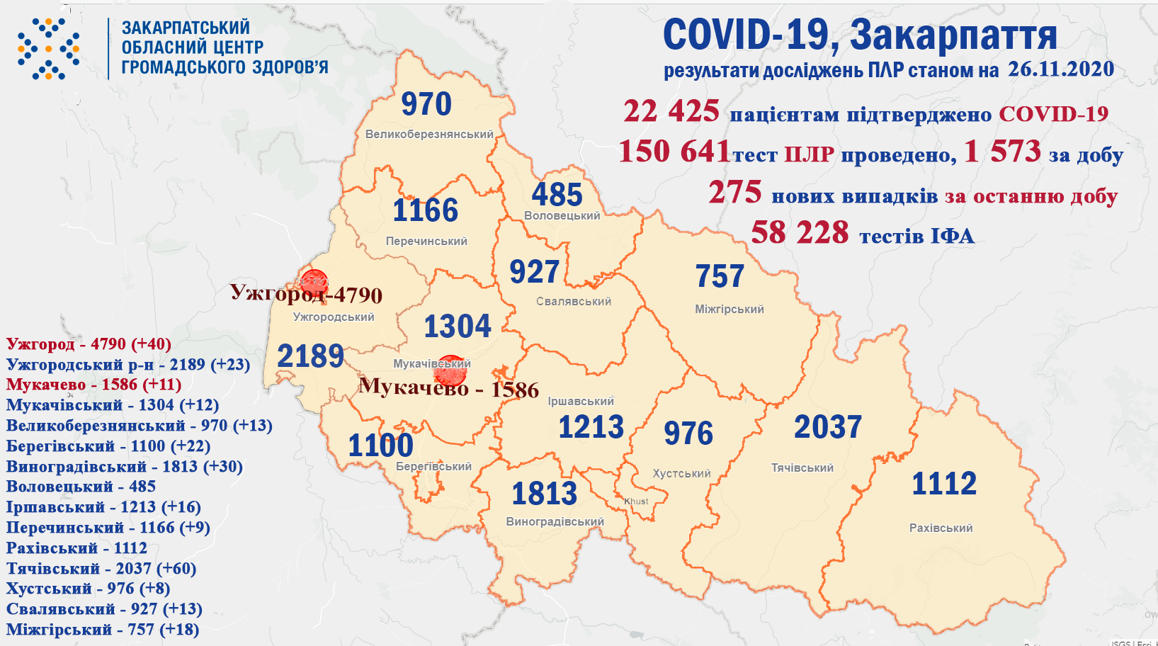 На Закарпатті за добу виявлено 275 випадків COVID-19