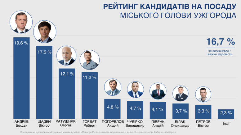 Соціологічна служба «Smartpoll» оприлюднила рейтинг кандидатів на посаду міського голови Ужгорода. Опитування проводилось за власною ініціативою з 14 по 18 серпня 2020р.