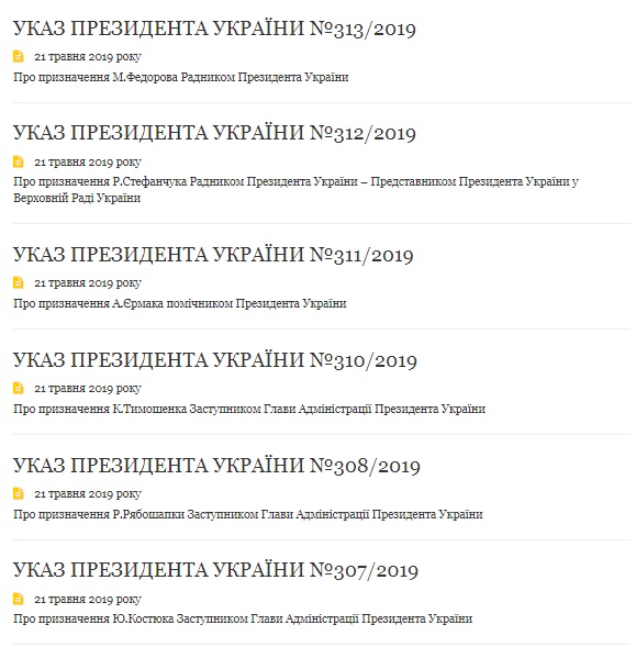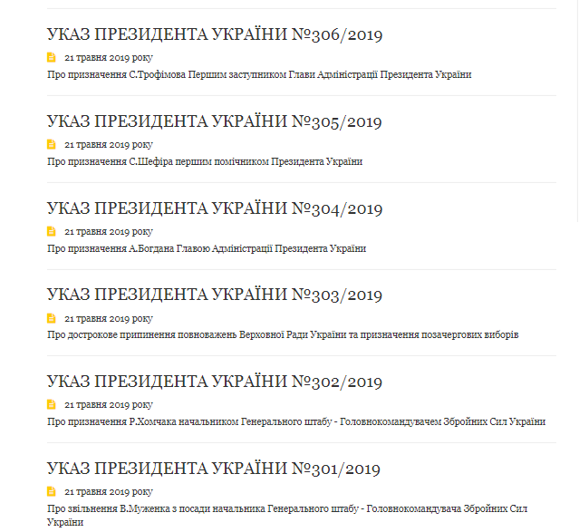 21 травня Президент України Володимир Зеленський видав 12 Указів. 11 з них стосувалися стосувалися кадрових призначень. Один щодо розпуску Верховної Ради та призначення позачергових виборів ВР. Повідомляє офіційний сайт голови держави.
