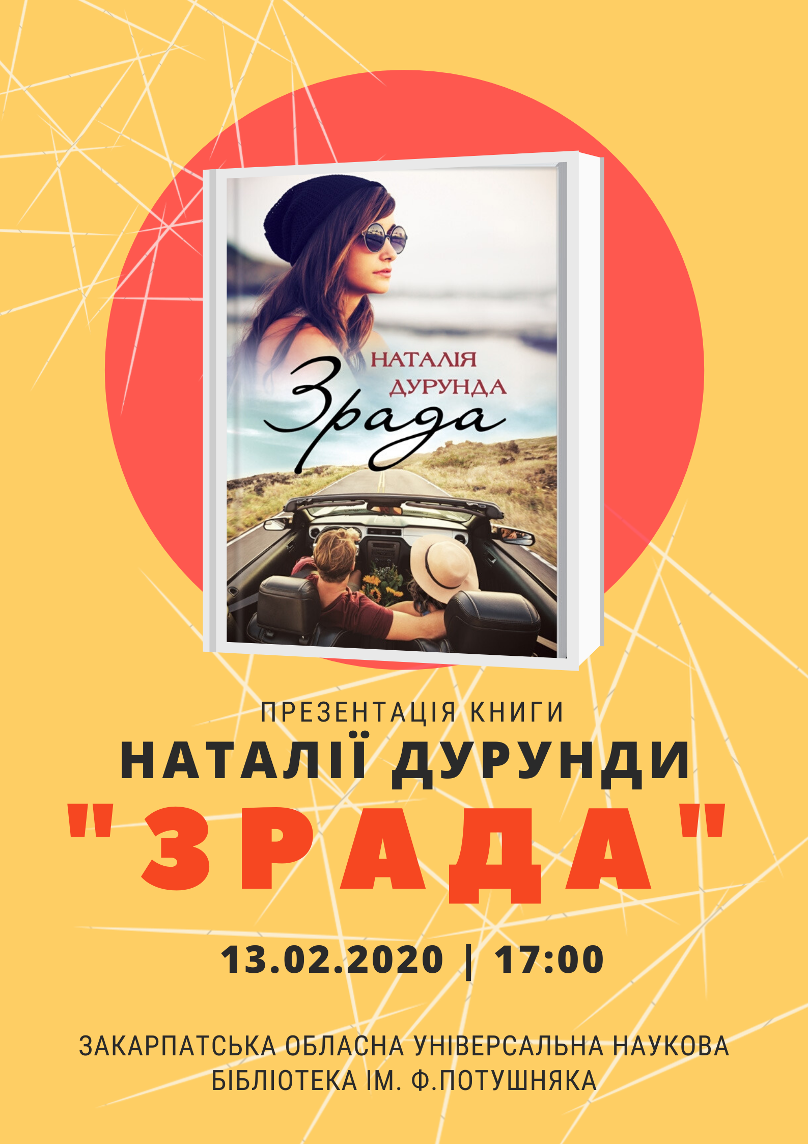 У четвер, 13 лютого, о 17:00 в Закарпатській обласній універсальній науковій бібліотеці ім. Ф. Потушняка відбудеться презентація нової книги Наталії Дурунди „Зрада”.