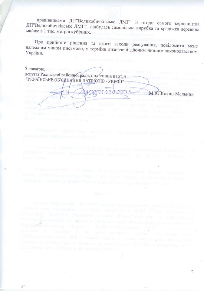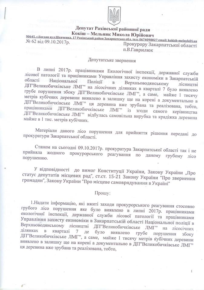 Депутат Рахівської районної ради Микола Кокіш-Мельник звернувся до прокурора Закарпатської області Володимира Гаврилюка з приводу розслідування крадіжки 1 тисячі кубічних метрів деревини на території ДП “Великобичківське ЛМГ”.