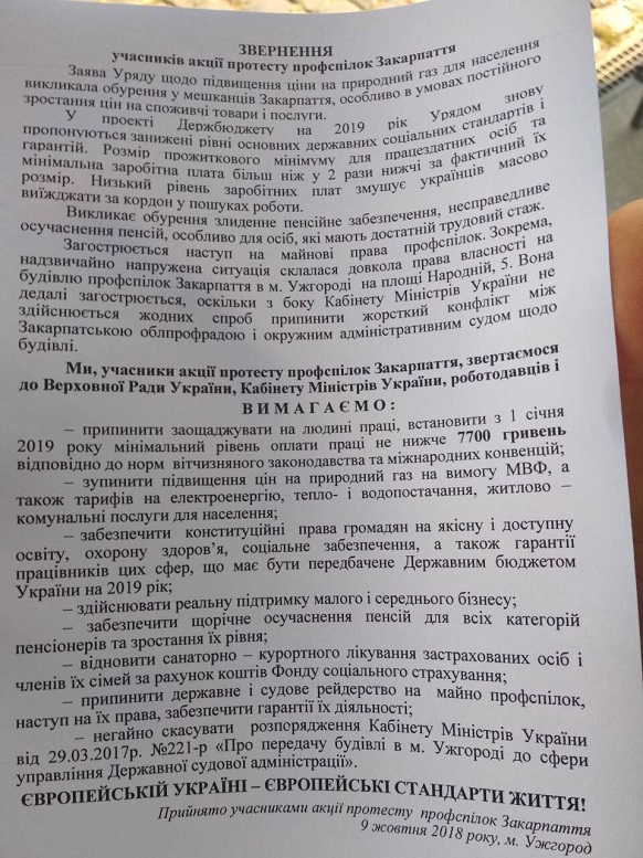 Представники Закарпатського облпрофради виступили із засудженням економічної політики уряду, збільшення цін і тарифів, зменшення купівельної спроможності працюючих і пенсіонерів, а також спроб позбавити професійні спілки майнових прав, в тому числі – будівлі на пл. Народій, 5.