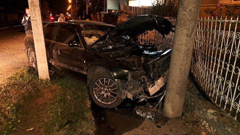 Якби пів метра правіше, то бетонний стовп когось відправив би в цій авто на той світ. В цьому випадку пошкодження паркану забрало на себе енергію швидкості.