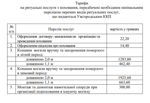 Нові тарифи на ритуальні послуги з поховання, що надаються комунальним підприємством “Ужгородський комбінат комунальних підприємств”, підтримали сьогодні на засіданні виконкому.