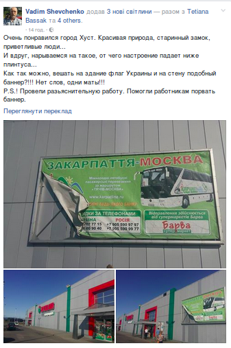 Гості Закарпаття були вражені рекламою розміщеною на супермаркеті “Сільверленд” у Хусті. Яскравий банер запрошував до поїздок в Москву. Небайдужі громадяни допомогли зірвати цю недоречність.