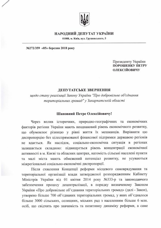 «Саме тому, разом із колегами Валерієм Лунченком та Василем Петьовкою звернулися до Президента України Петра Порошенка, Прем’єр-міністра Володимира Гройсмана, голів Закарпатської ОДА Геннадія Москаля та Закарпатської облради Михайла Рівіса із проханням забезпечити єдність державної політики щодо формування територій громад та територіальної організації влади на шляху до згуртованості державного простору. Сподіваємося на підтримку усіх сторін у цьому процесі», – заявив парламентар.