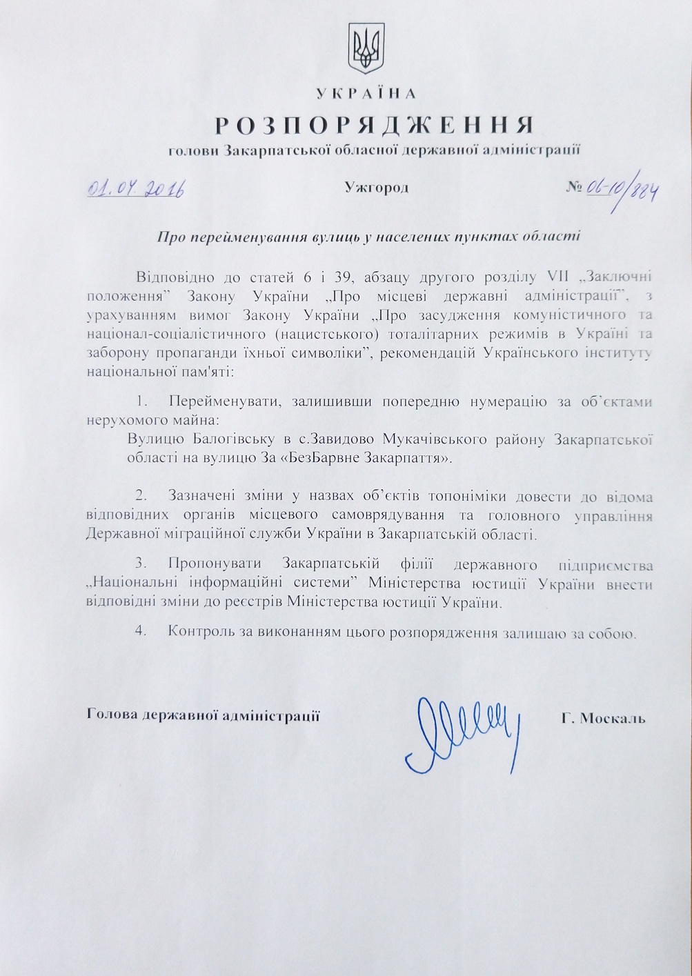 Москаль перейменував вулицю Балогівську в Завидові на вулицю «За «БезБарвне Закарпаття» (ДОКУМЕНТ)