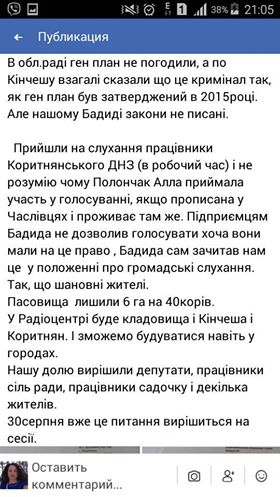 До речі, діючий генплан затверджений у 2015 році і згідно чинного законодавства його неможна змінювати на протязі 5 років. Однак можлива кримінальна відповідальність не зупинила Коритнянського сілького голову Ігора Бадиду і таємні слухання все ж таки відбулися.